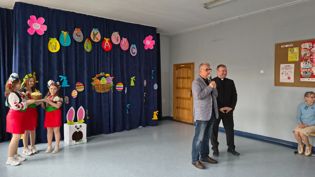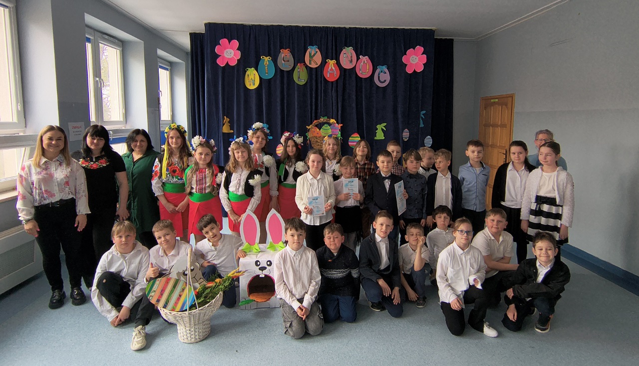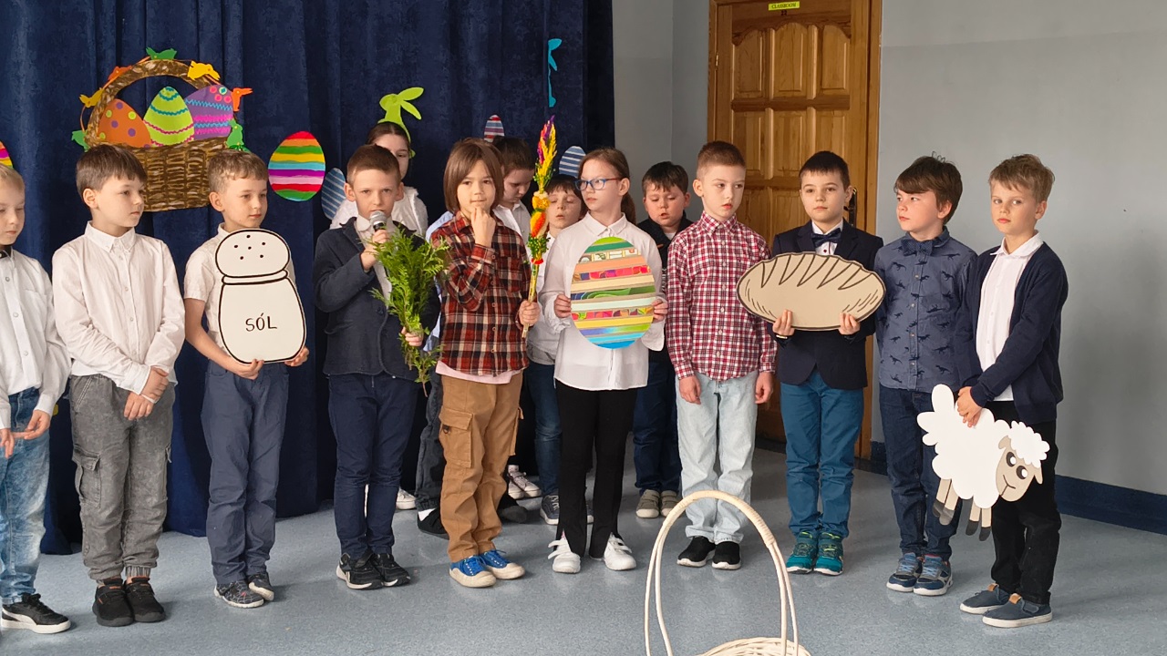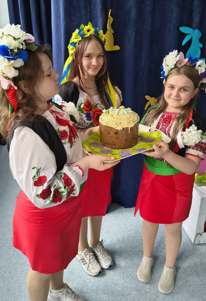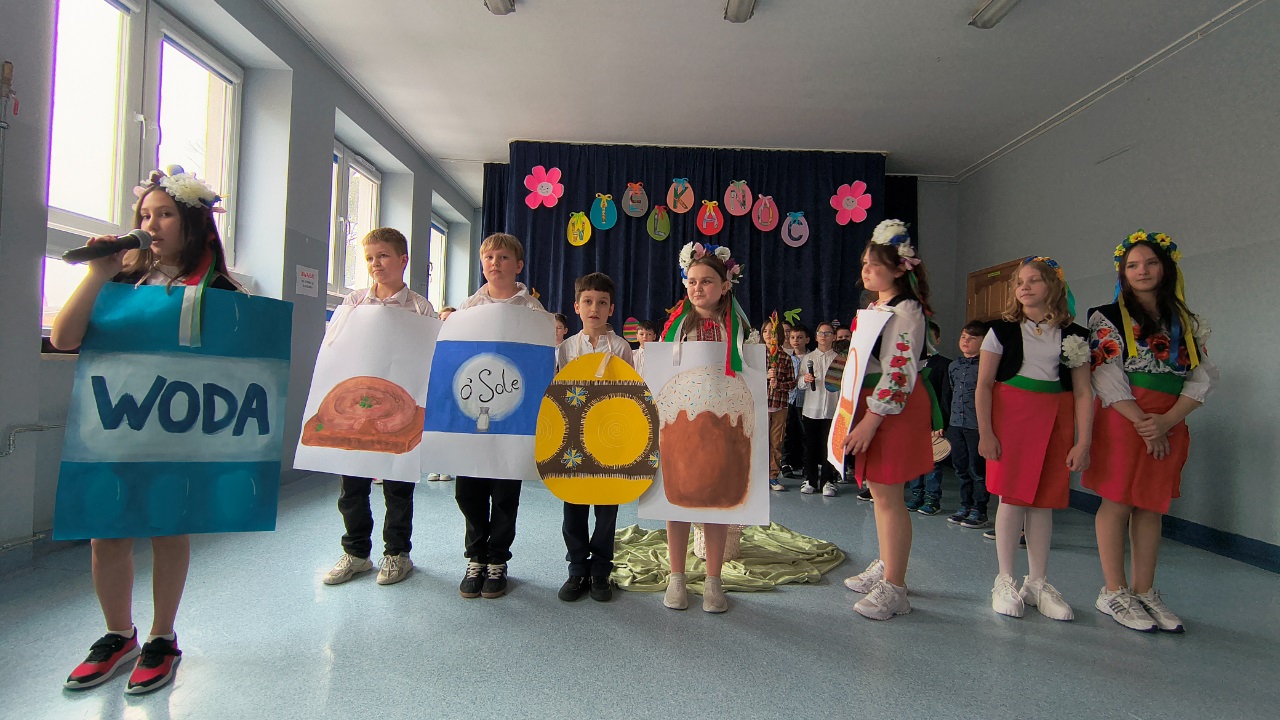 i piosenki o tematyce wiosennej i świątecznej, które wprowadziły wszystkich w radosny nastrój, a także prezentacja symboli wielkanocnych, takich jak baranek (symbol zwycięstwa życia nad śmiercią), jajka (znak nowego życia) oraz palma wielkanocna. Uczniowie przypomnieli też o tradycji śmigusa-dyngusa. O tradycjach wielkanocnych opowiedzieli nam również uczniowie z Ukrainy. Dziewczynki zaprezentowały tradycyjny ludowy taniec oraz wręczyły Panu Dyrektorowi paschę – najważniejszy symbol Świąt Wielkanocnych w kulturze Ukraińskiej.